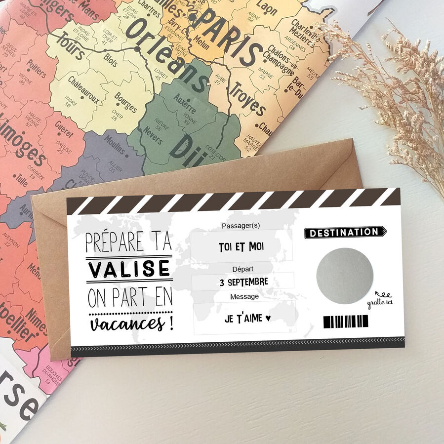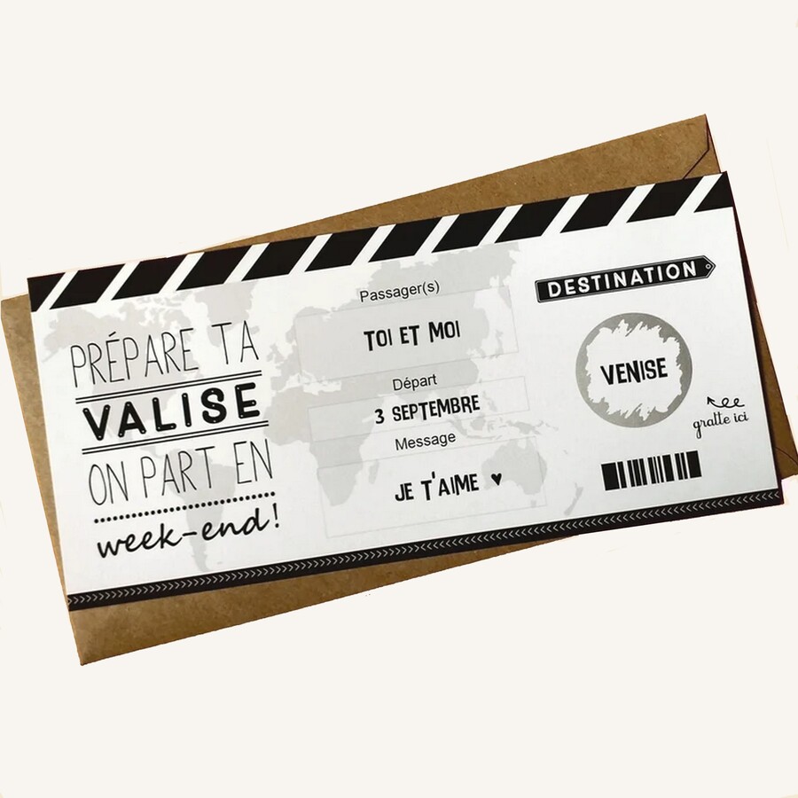 Vous avez prévu d'offrir un voyage à votre proche? Faites-lui la surprise de la destination en lui offrant notre carte à gratter version ticket d'embarquement !! Une carte originale, ludique et personnalisée par vos soins, puisque c'est à vous de la remplir!