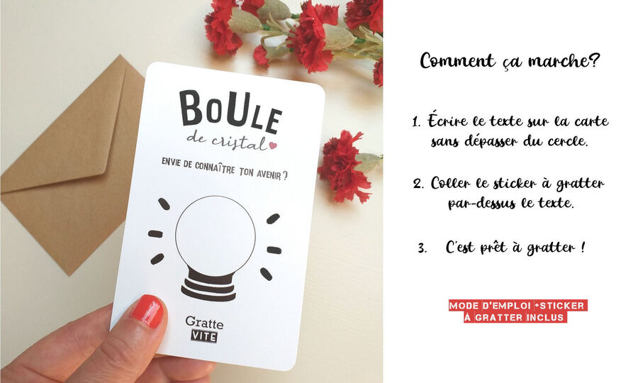 Annonce, message, cadeau ou surprise... la carte à gratter "Boule de cristal" fera à coup sûr son petit effet! Cette carte est à personnaliser par vos soins, la boutique ne propose pas la personnalisation.