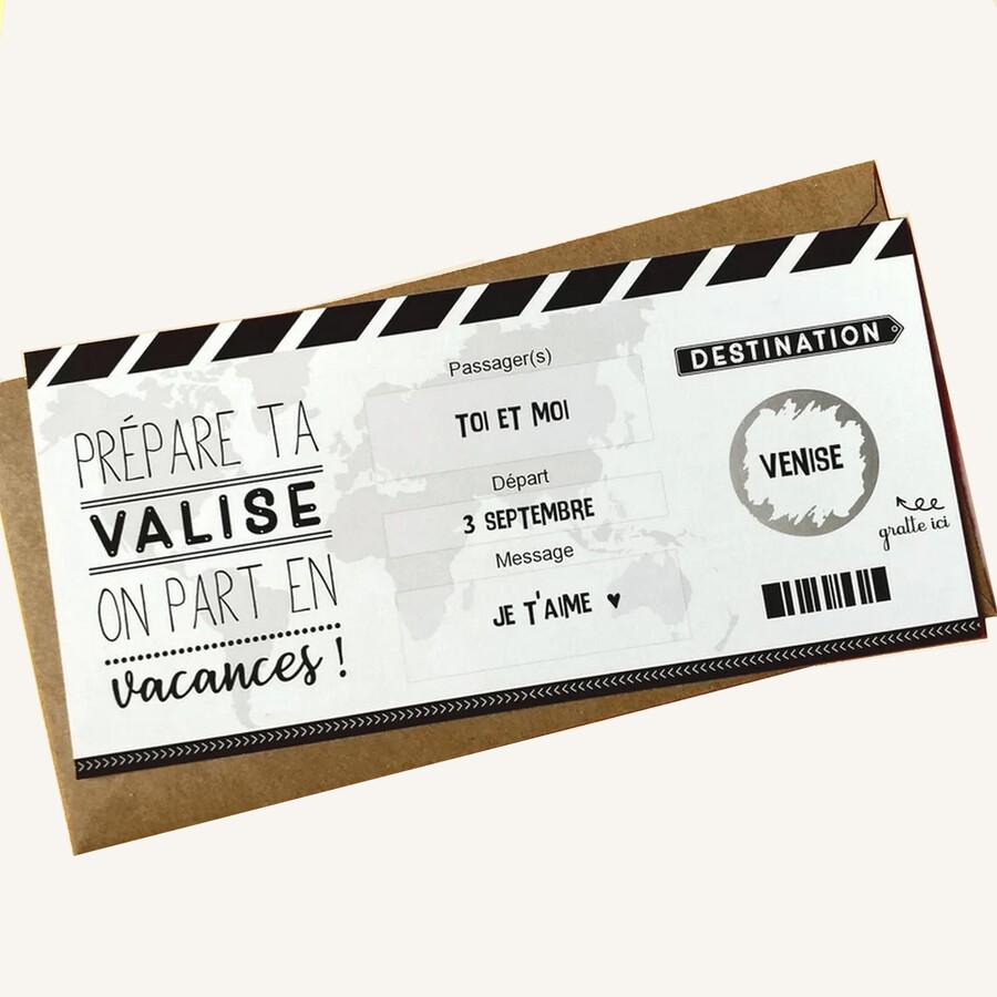 Vous avez prévu d'offrir un voyage à votre proche? Faites-lui la surprise de la destination en lui offrant notre carte à gratter version ticket d'embarquement !! Une carte originale, ludique et personnalisée par vos soins, puisque c'est à vous de la remplir!