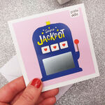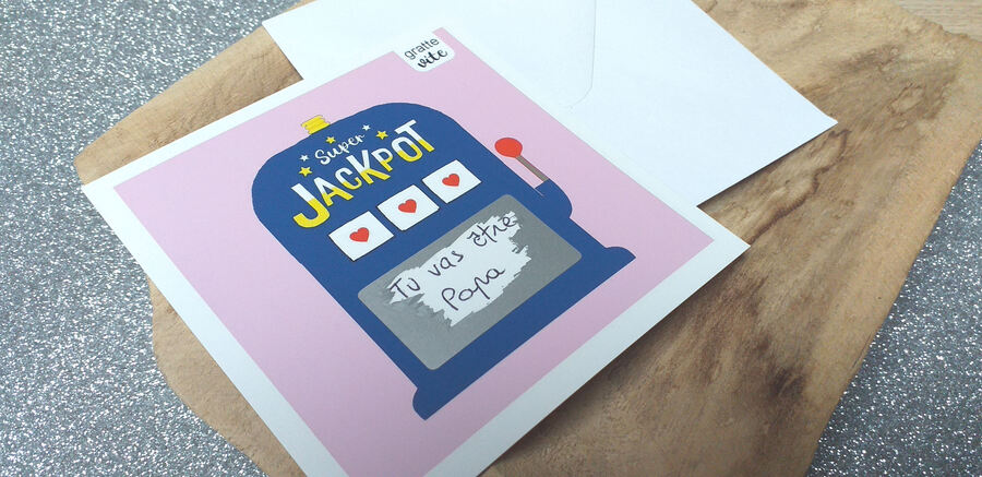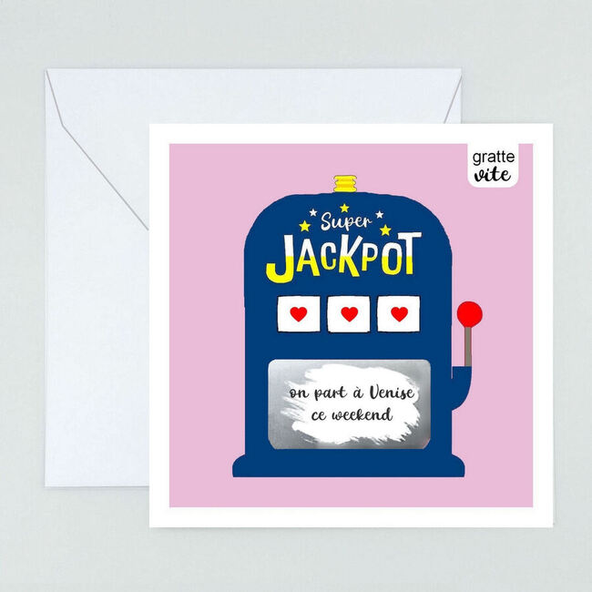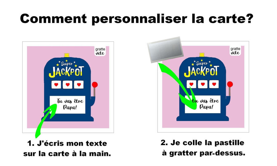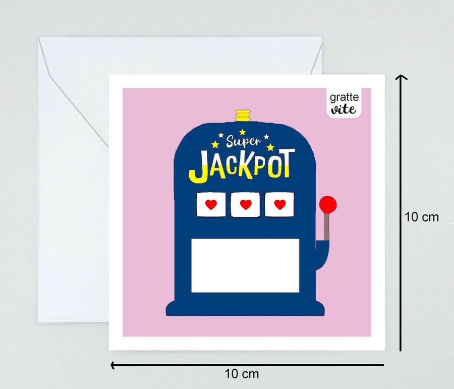 La carte à gratter Super Jackpot est entièrement personnalisable par vos soins. La boutique ne propose pas la personnalisation de la carte. Ecrivez votre texte sur la carte et coller par-dessus la pastille à gratter.