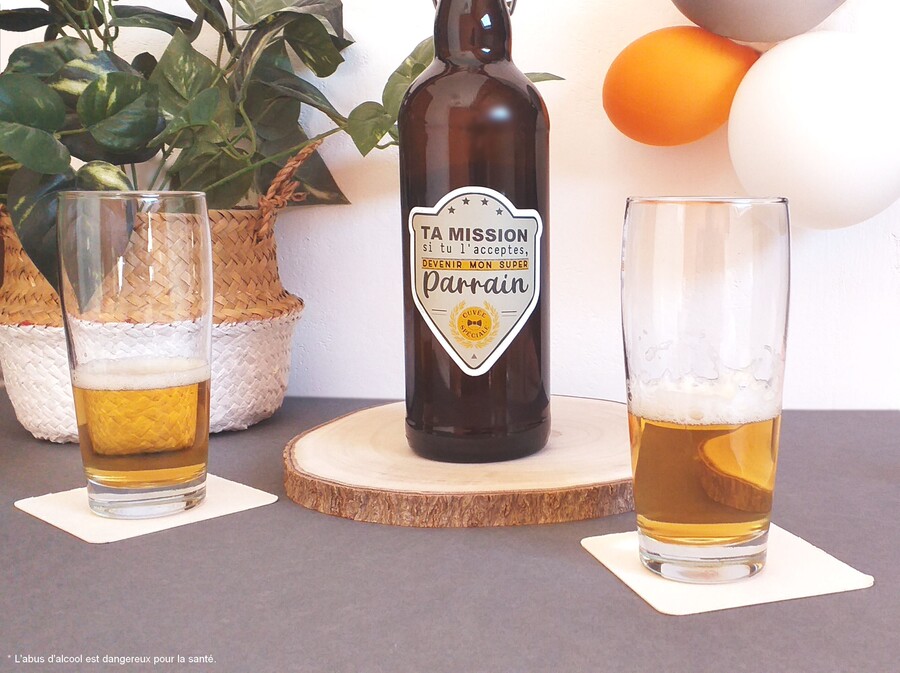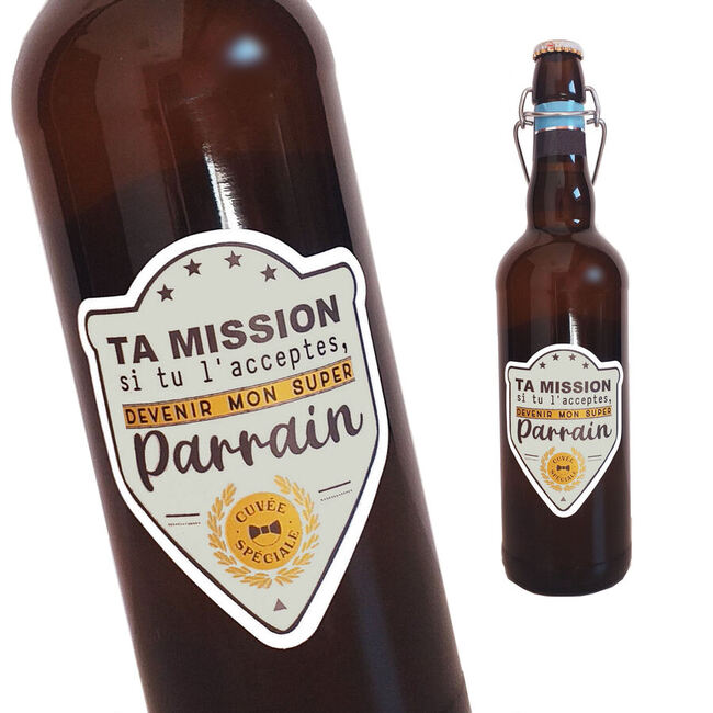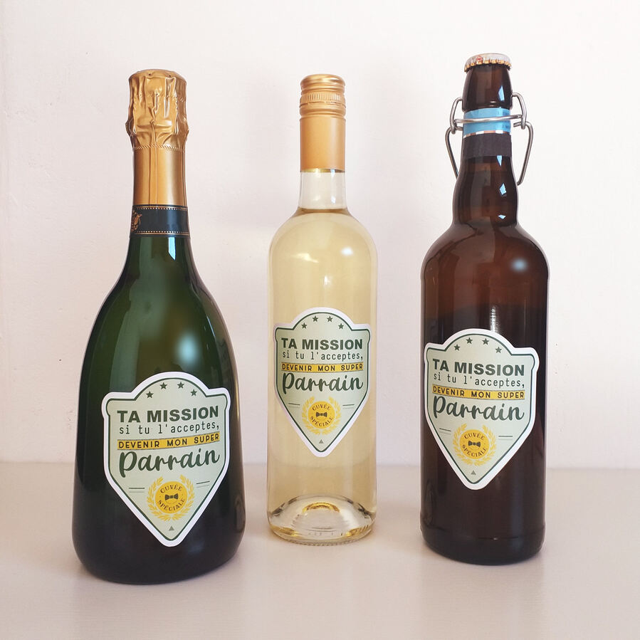 Vous avez trouvé le Parrain idéal pour votre enfant et vous souhaitez faire votre demande de manière originale? Surprenez-le avec notre jolie étiquette pour bouteille!