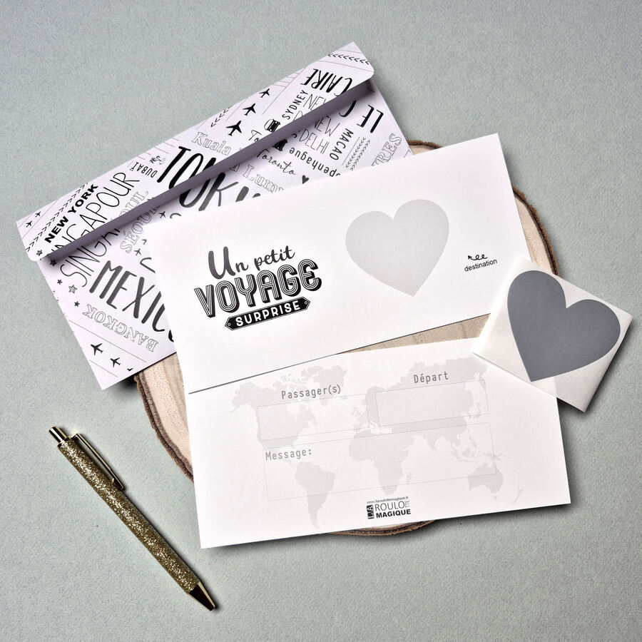Vous avez prévu d'offrir un voyage à votre proche? Faites-lui la surprise de la destination en lui offrant notre carte à gratter personnalisable par vos soins & prête à offrir dans sa jolie enveloppe assortie imprimée recto verso !! (La boutique ne propose pas la personnalisation de la carte)